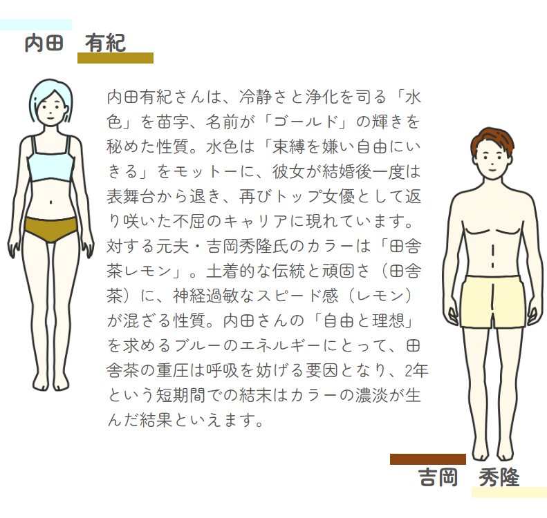 対する元夫・吉岡秀隆氏のカラーは「田舎茶レモン」。土着的な伝統と頑固さ(田舎茶)に、神経過敏なスピード感(レモン)が混ざる性質です。内田さんの持つ「自由と理想」を求めるブルーのエネルギーにとって、田舎茶の重圧は呼吸を妨げる要因となり、2年という短期間での結末はカラーの速度差が生んだ必然といえます。