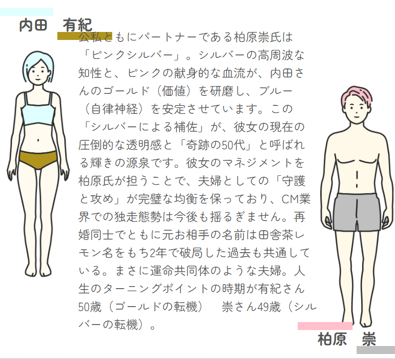 現在、公私ともにパートナーである柏原崇氏は「ピンクシルバー」。シルバーの高周波な知性と、ピンクの献身的な血流が、内田さんのゴールド(価値)を研磨し、水色(自律神経)を安定させています。この「シルバーによる補佐」が、彼女の現在の圧倒的な透明感と「奇跡の50代」と呼ばれる輝きの源泉です。最新の動向では、彼女のマネジメントを柏原氏が担うことで、夫婦としての「守護と攻め」が完璧な均衡を保っており、CM業界での独走態勢は今後も揺るぎません。類似カラーの有名人としては、同じく水色の静謐さと芯の強さを併せ持つ「羽生結弦」のような、時代を超越するプロフェッショナルで変わらない体型維持と年齢を重ねて益々磨きがかかる気品が類似しています。